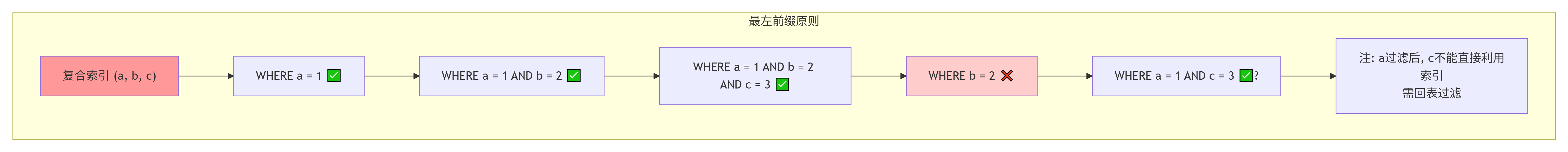 SELECT * FROM table WHERE a = 1 AND b = 2 AND c = 3; -- 使用索引(a,b,c)