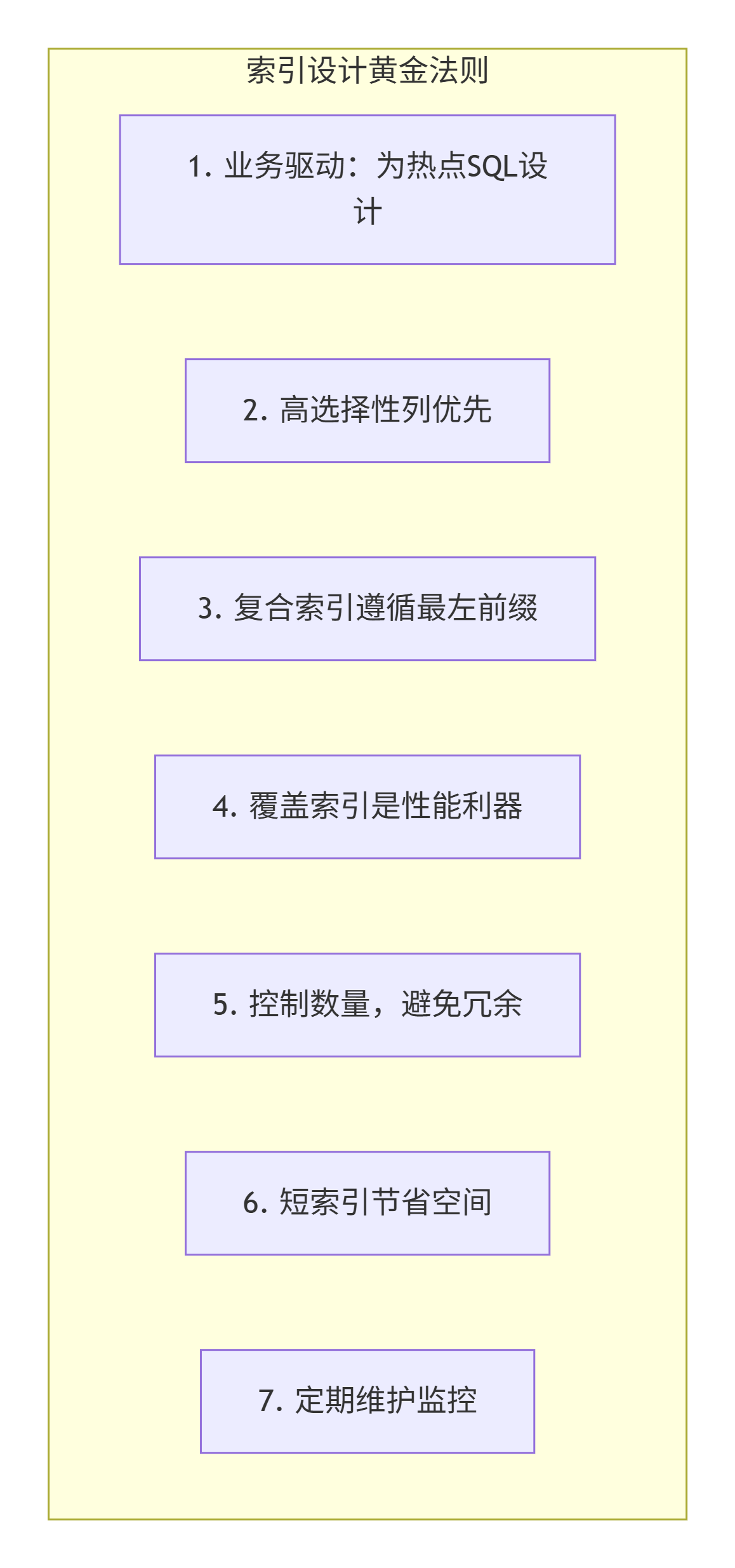 -- 或使用索引下推(MySQL 5.6+)九、索引设计检查清单