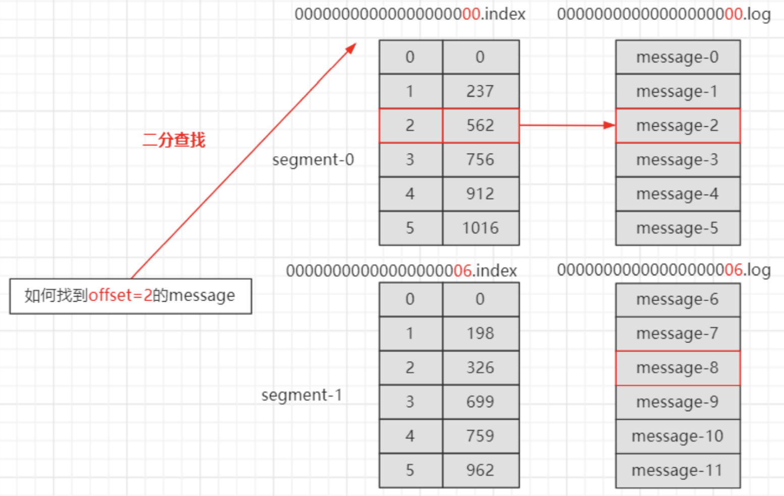 查找原理是:文件头的偏移量和文件大小快速定位。“.index”文件存储大量的索引信息,在查找index的时候使用的是二分查找法,“.log”文件存储大量的数据,索引文件中的元数据指向对应数据文件中 message的物理偏移地址。