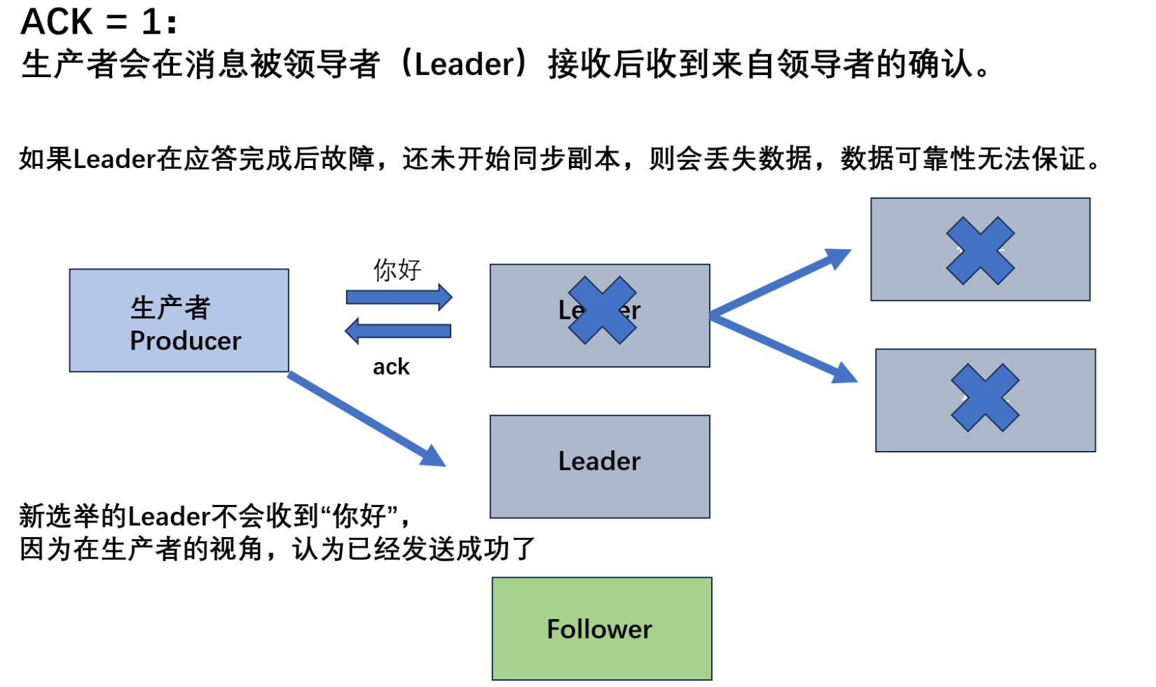 producer等待broker的ack,partition的leader落盘成功后返回ack,如果在follower同步成功之前leader故障,那么将会丢失数据;