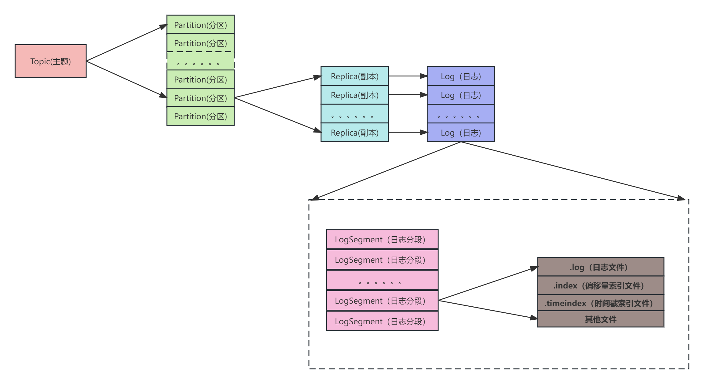 - 为了防止日志(Log)过大,Kafka引入了日志分段(LogSegment)的概念,将日志切分成多个日志分段。在磁盘上,日志是一个目录,每个日志分段对应于日志目录下的日志文件、偏移量索引文件、时间戳索引文件(可能还有其他文件)