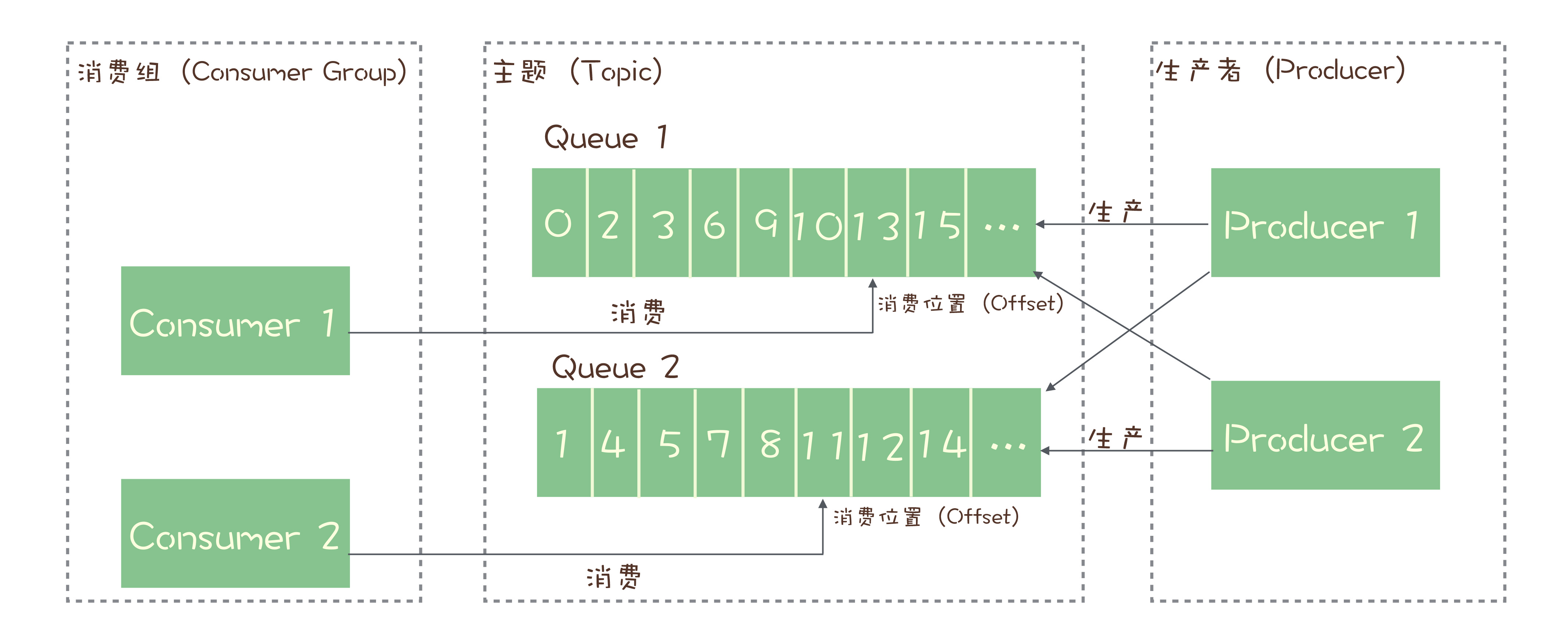 我们可以看到,每个Partition中的消息都是有序的,生产的消息被不断追加到Partition log上,其中的每一个消息都被赋予了一个唯一的offset值。