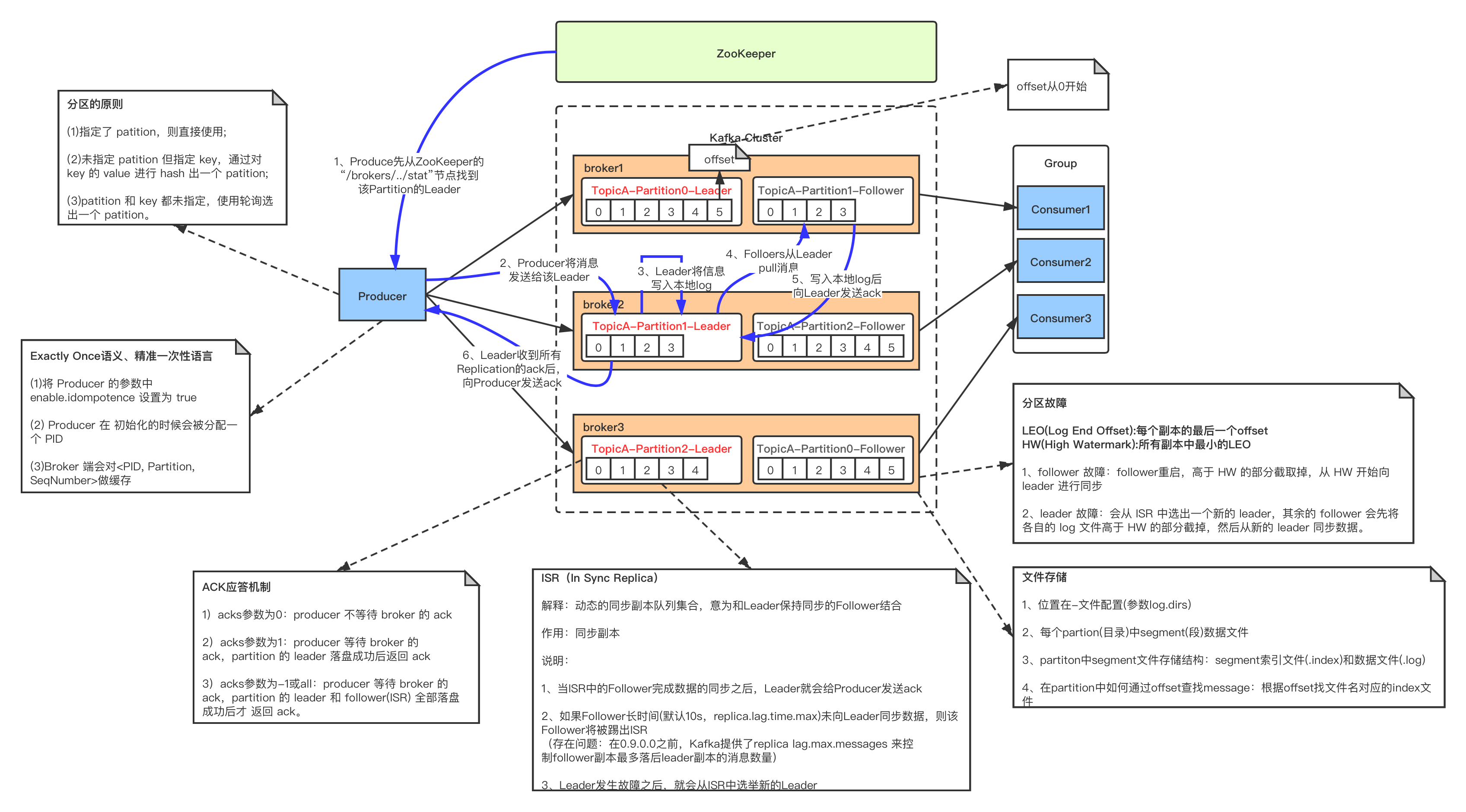 - 当ISR中所有Replica都向Leader发送ACK时,leader才commit