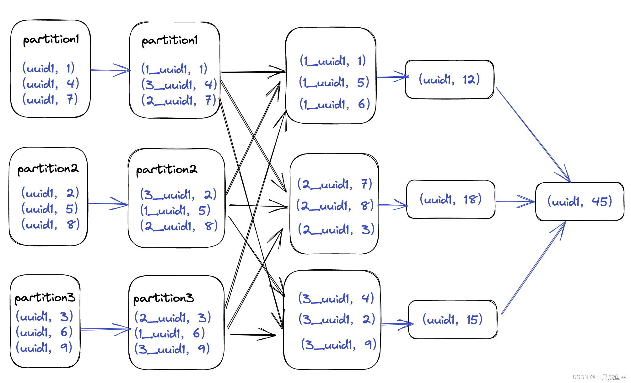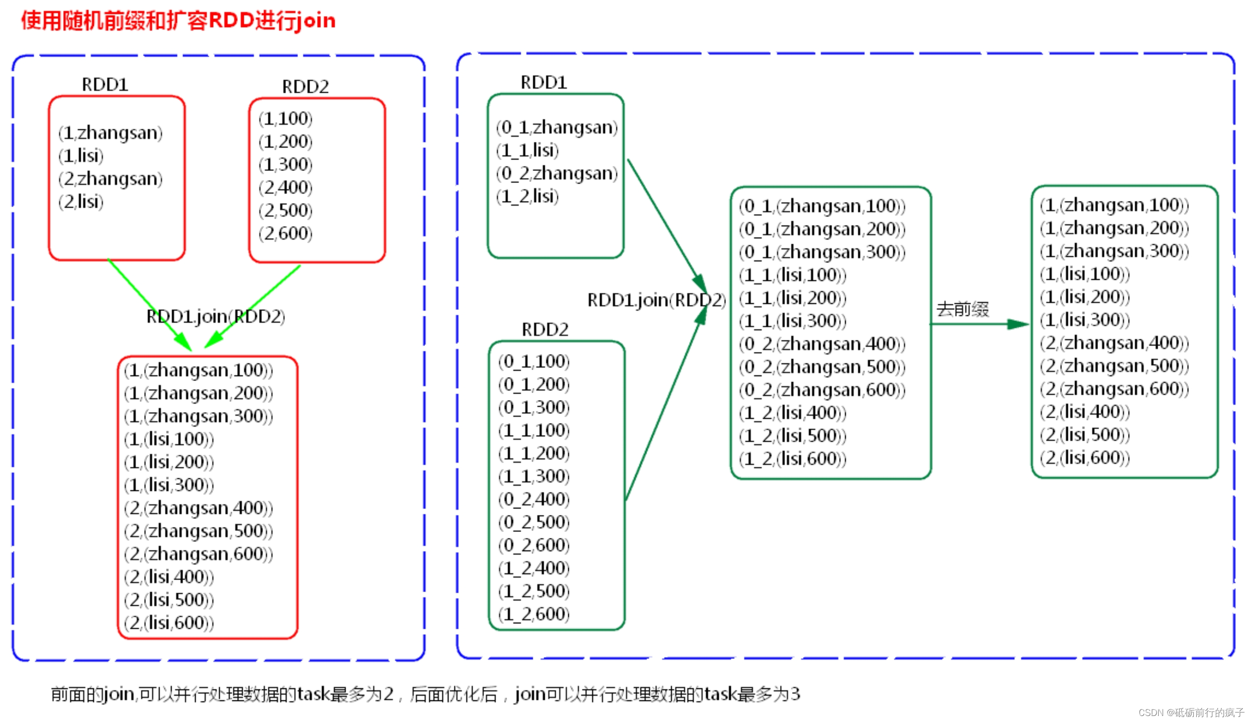 - 同时对另外一个正常的RDD进行扩容,将每条数据都扩容成n条数据,扩容出来的每条-数据都依次打上一个0~n的前缀。