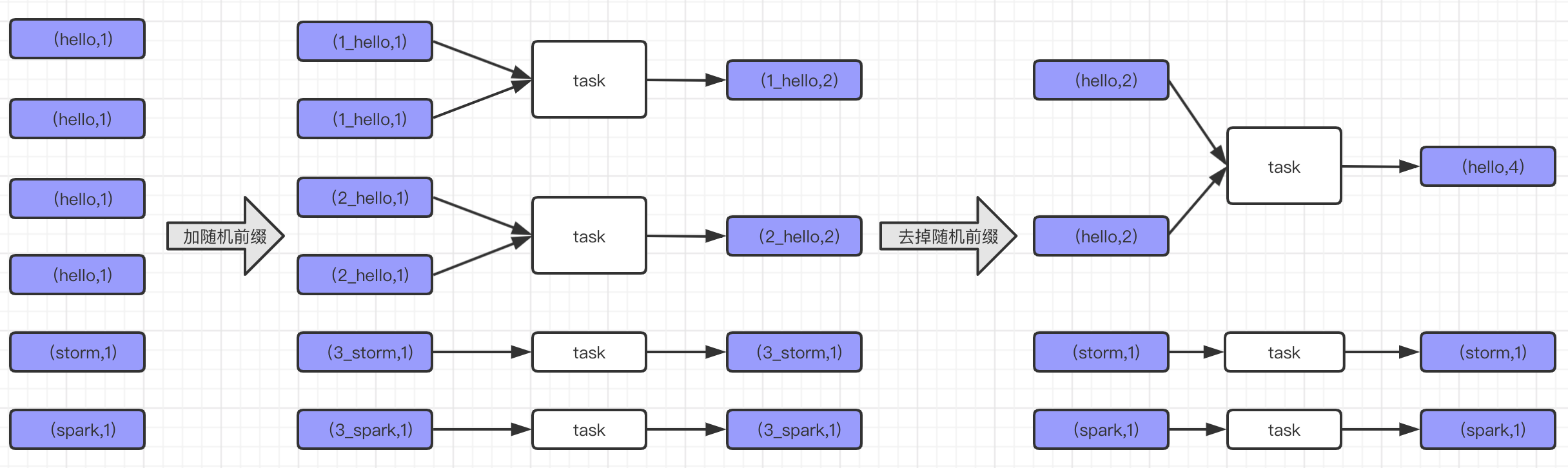 方案实现原理:将原本相同的key通过附加随机前缀的方式,变成多个不同的key,就可以让原本被一个task处理的数据分散到多个task上去做局部聚合,进而解决单个task处理数据量过多的问题。接着去除掉随机前缀,再次进行全局聚合,就可以得到最终的结果。具体原理见下图。