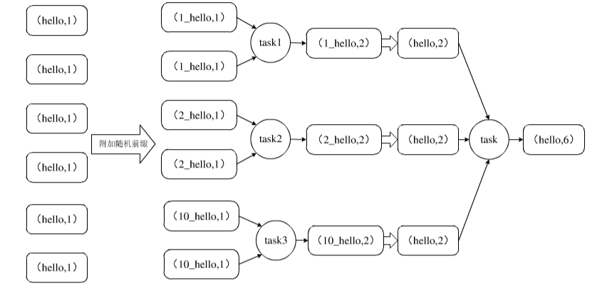 方案实现思路:这个方案的核心实现思路就是进行两阶段聚合。第一次是局部聚合,先给每个key都打上一个随机数,比如10以内的随机数,此时原先一样的key就变成不一样的了,比如(hello, 1) (hello, 1) (hello, 1) (hello, 1),就会变成(1_hello, 1) (1_hello, 1) (2_hello, 1) (2_hello, 1)。接着对打上随机数后的数据,执行reduceByKey等聚合操作,进行局部聚合,那么局部聚合结果,就会变成了(1_hello, 2) (2_hello, 2)。然后将各个key的前缀给去掉,就会变成(hello,2)(hello,2),再次进行全局聚合操作,就可以得到最终结果了,比如(hello, 4)。