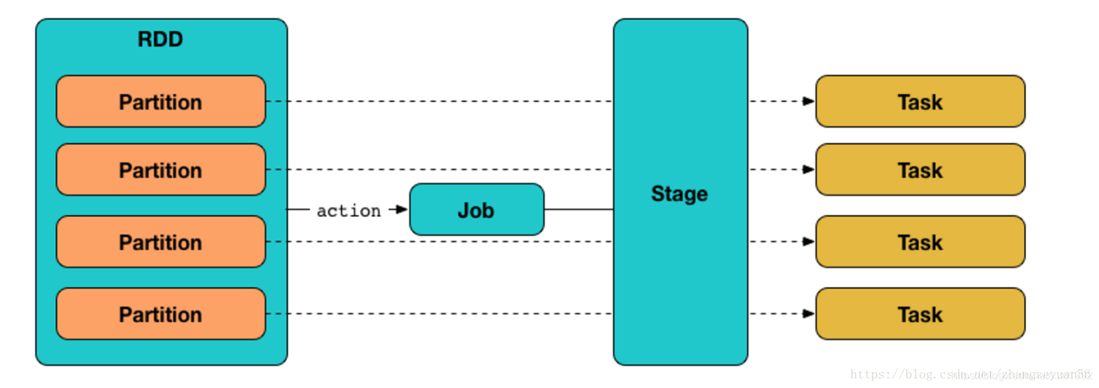 一个spark application提交后遇到一个Action算子就会生成一个job执行;根据RDD之间的依赖关系分为宽依赖和窄依赖,遇到一个宽依赖就会分为一个stage,Stage是一个TaskSet,将Stage划分的结果发送到不同的Executor执行即为一个Task。注意:Application->Job->Stage->Task每一层都是1对n的关系,通常设置的分区个数就是task并行度的个数。一个application到task的关系可以如下图表示: