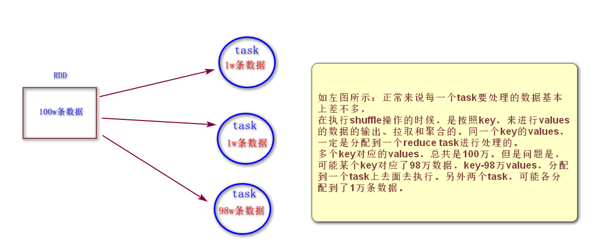 在进行shuffle的时候,必须将各个节点上相同的key拉取到某个节点上的一个task来进行处理,比如按照key进行聚合或join等操作。此时如果某个key对应的数据量特别大的话,那么这些数据就会被拉去到同一个task执行,就会发生数据倾斜。比如大部分key对应10条数据,但是个别key却对应了100万条数据,那么大部分task可能就只会分配到10条数据,然后1秒钟就运行完了;但是个别task可能分配到了100万数据,要运行一两个小时。因此,整个Spark作业的运行进度是由运行时间最长的那个task决定的。