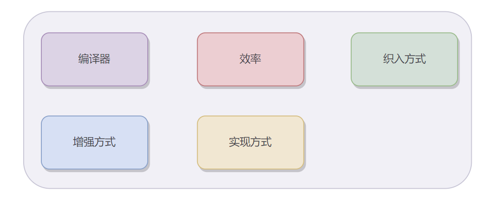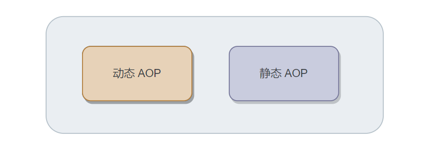 - 「动态 AOP 实现」, AOP 框架「在运行阶段」对动态生成代理对象(在内存中以 JDK 动态代理,或 CGlib 动态地生成 AOP 代理类),如 SpringAOP;