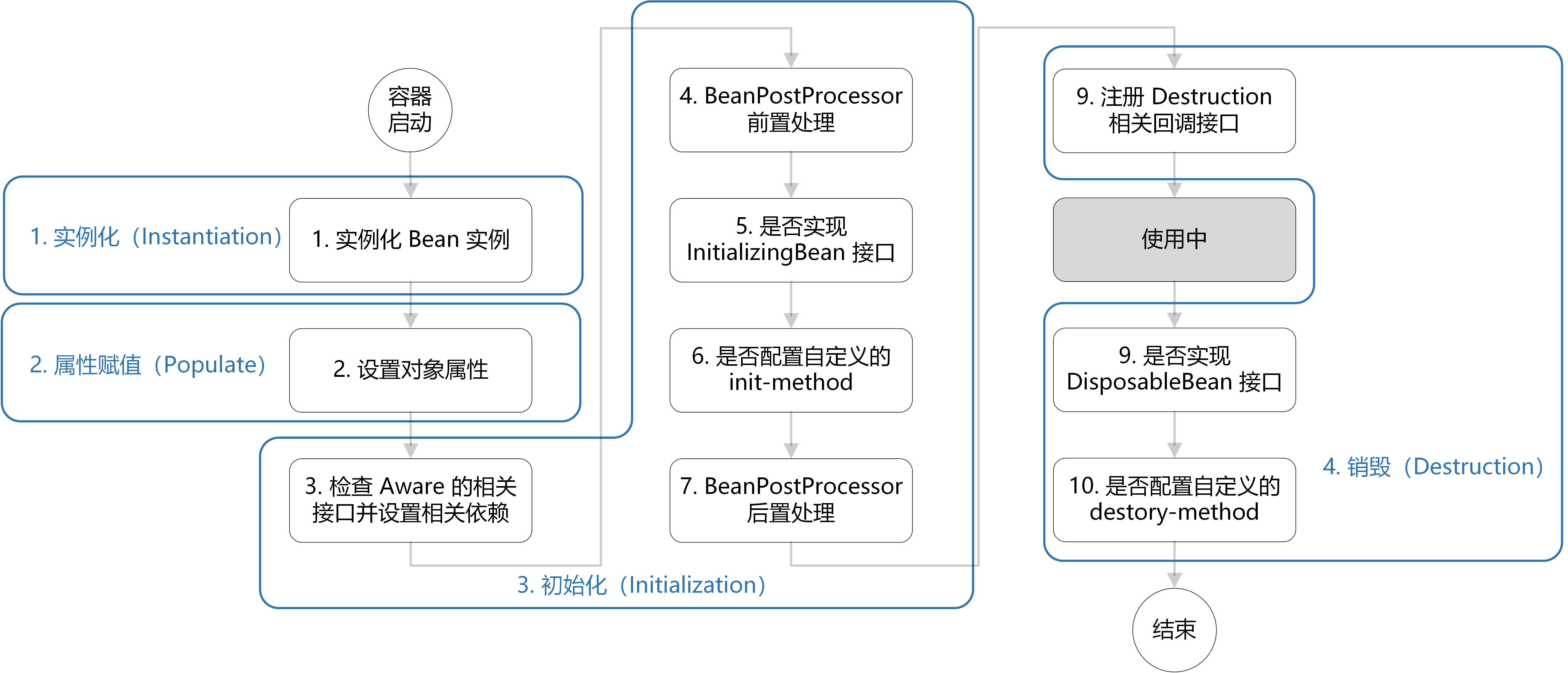 - 发布事件:如果bean实现了ApplicationListener接口或者在bean定义中配置了监听的事件,Spring容器会发布相应的事件。