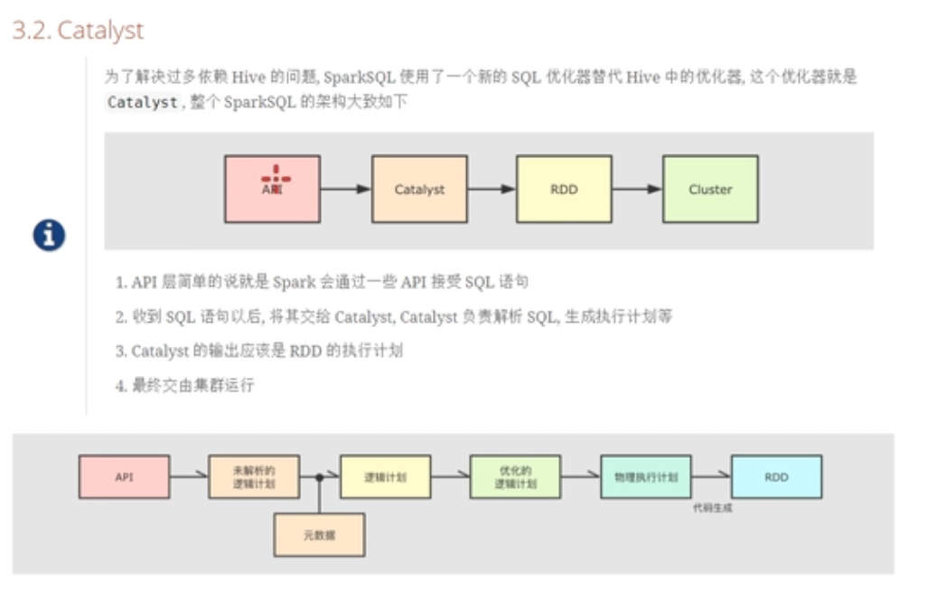 SparkSQL模块主要将以前依赖Hive框架代码实现的功能自己实现,称为Catalyst引擎。